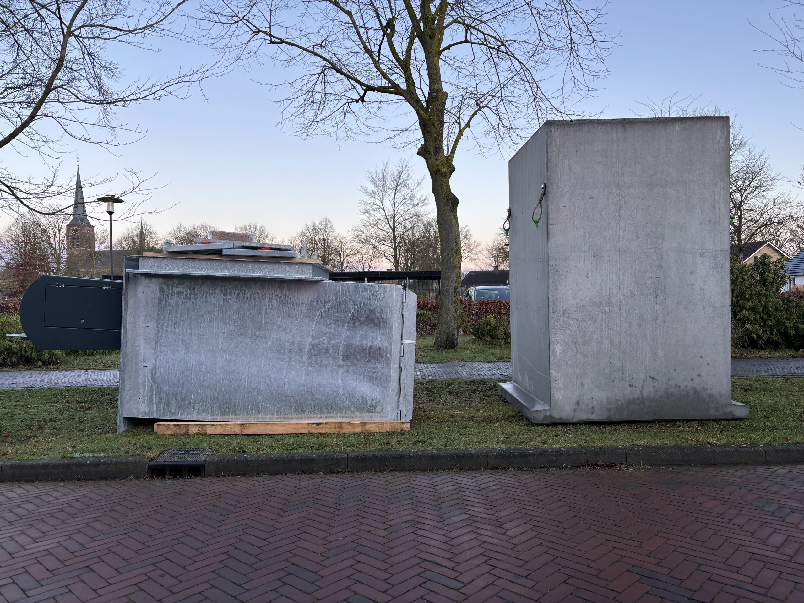 In de berm van de Sprenkstraat staan een paar betonnen gevaartes te wachten om de grond in te gaan. Het zijn de nieuwe glas- en luiercontainers; ze zullen binnenkort de huidige containers voor aan de straat vervangen (maar dan dus op ongeveer deze plek).